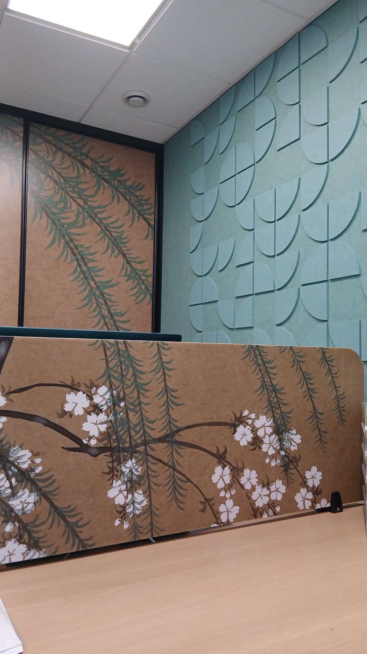 Akoestische oplossingen helpen geluidsoverlast te reduceren door materialen te gebruiken met een hoge geluidsabsorbtie. Deze kunnen op allerlei manieren worden toegepast, zowel aan plafond, wand, of vrijstaand in de ruimte. Onze unieke mogelijkheid om PETvilt panelen te printen, maken de mogelijkheden eindeloos.